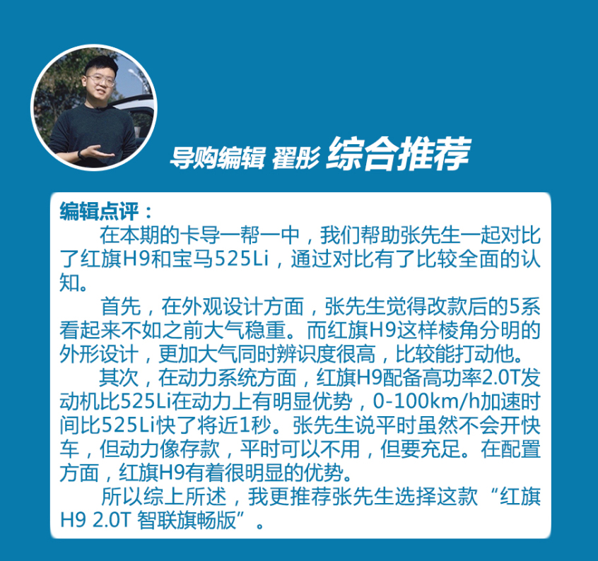 分析:与张先生的沟通过后,我们大致了解了他的喜好与需求。张先生想选一台,价格在40万上下的中大型轿车,配置高、有设计感,外形优雅大气。目标车型为红旗H9、宝马5系。如果选择红旗H9可以购买2.0T的顶配车型,而如果选择5系的话,张先生的预算只能买到入门的525Li。